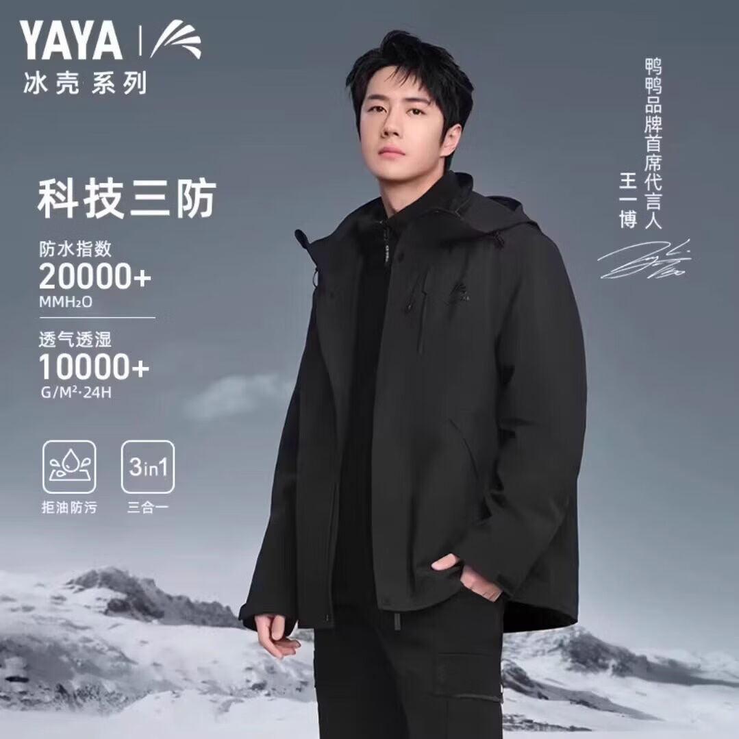 鸭鸭(YAYA)王一博同款冰壳系列2.0冲锋衣羽绒服男冬季三合一防寒保暖外套HY 青光黑色 180/96A(XL)