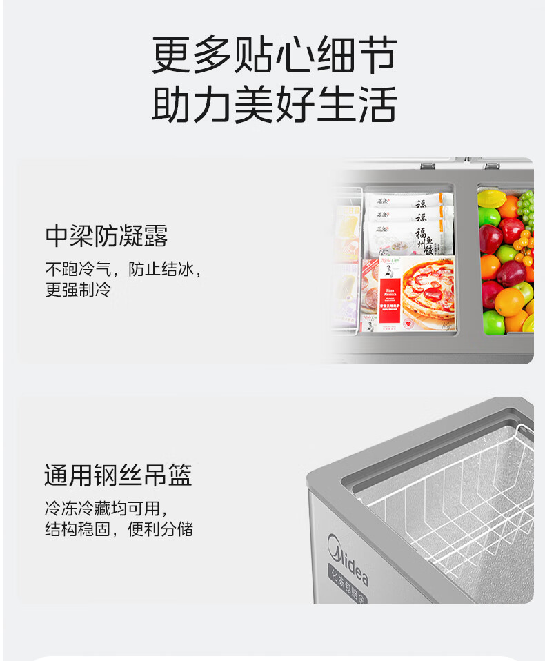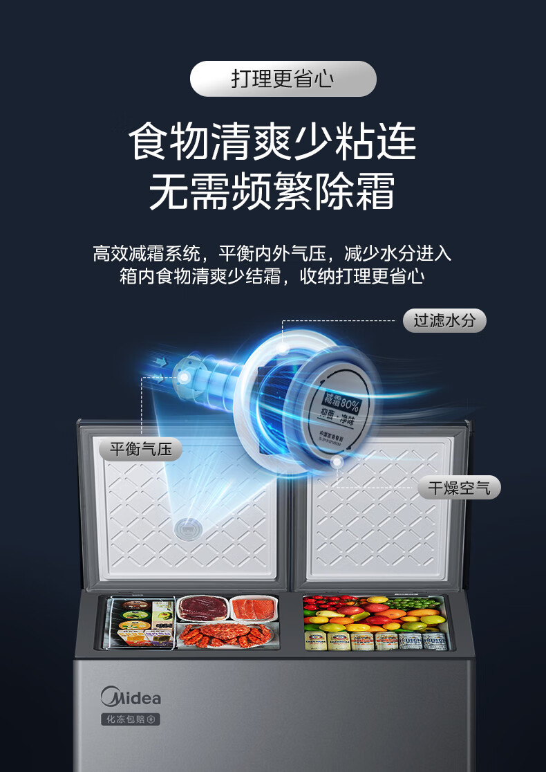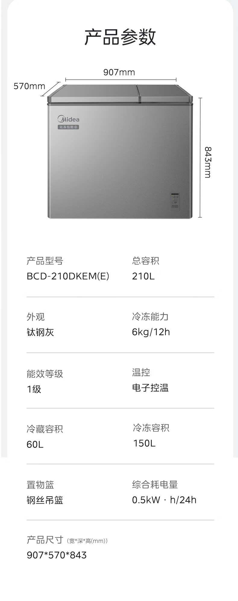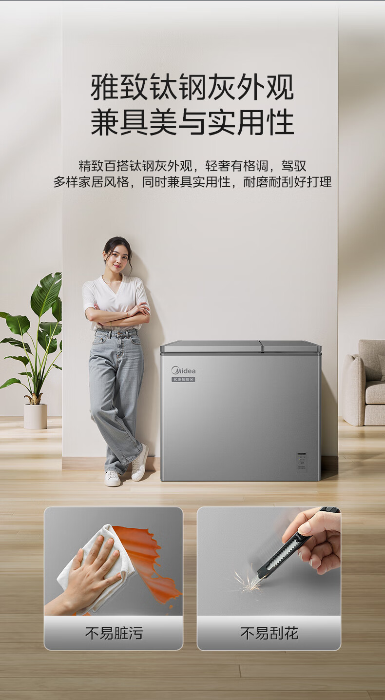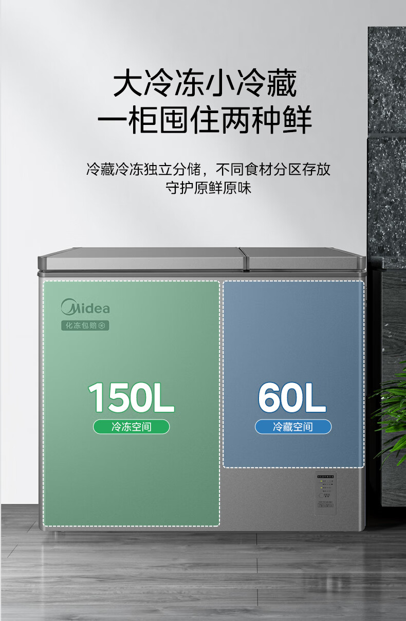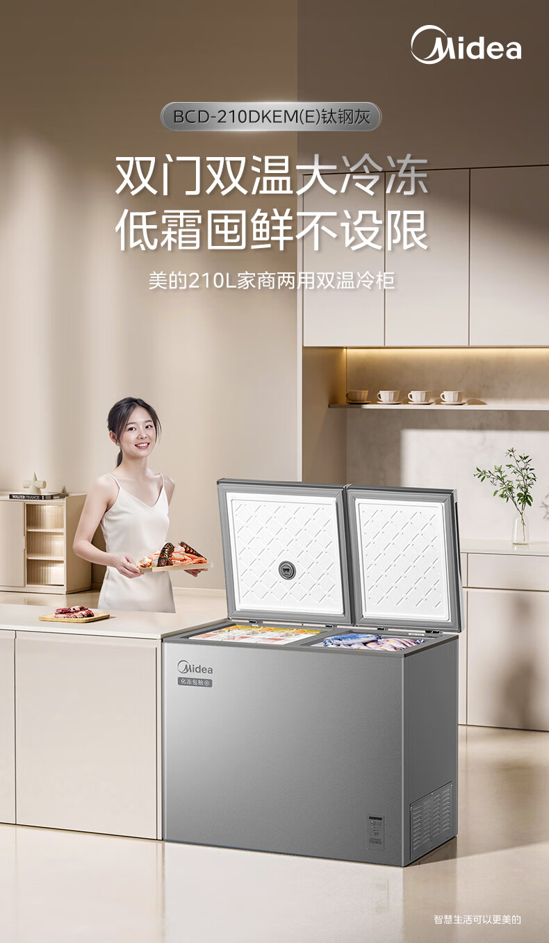 美的(Midea)210升双温双箱家商两用冰柜大冷冻小冷藏卧式节能低音冷柜小型冰箱BCD-210DKEM(E)钛钢灰国家补贴