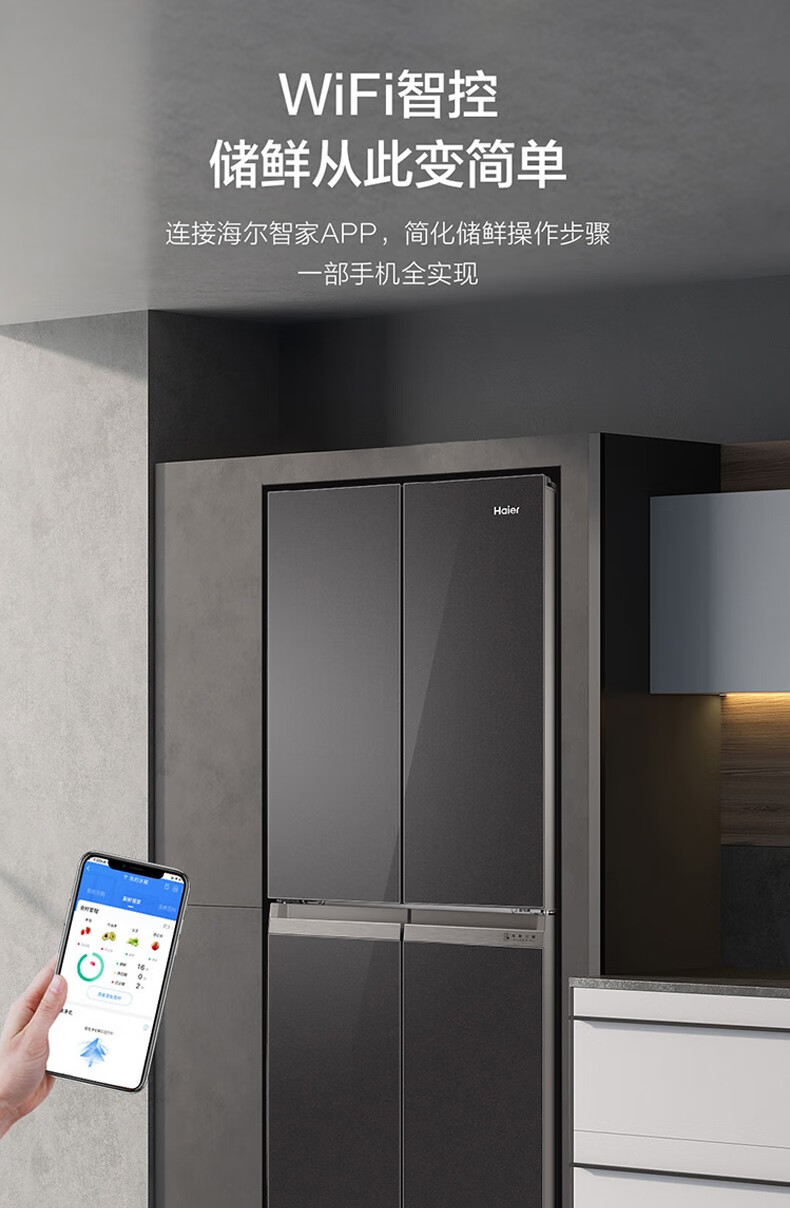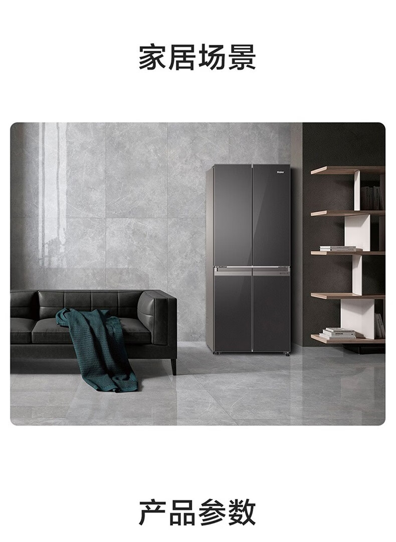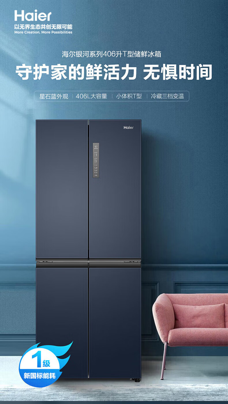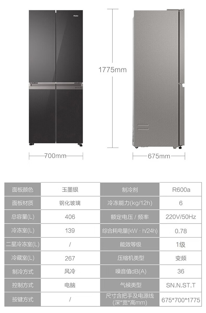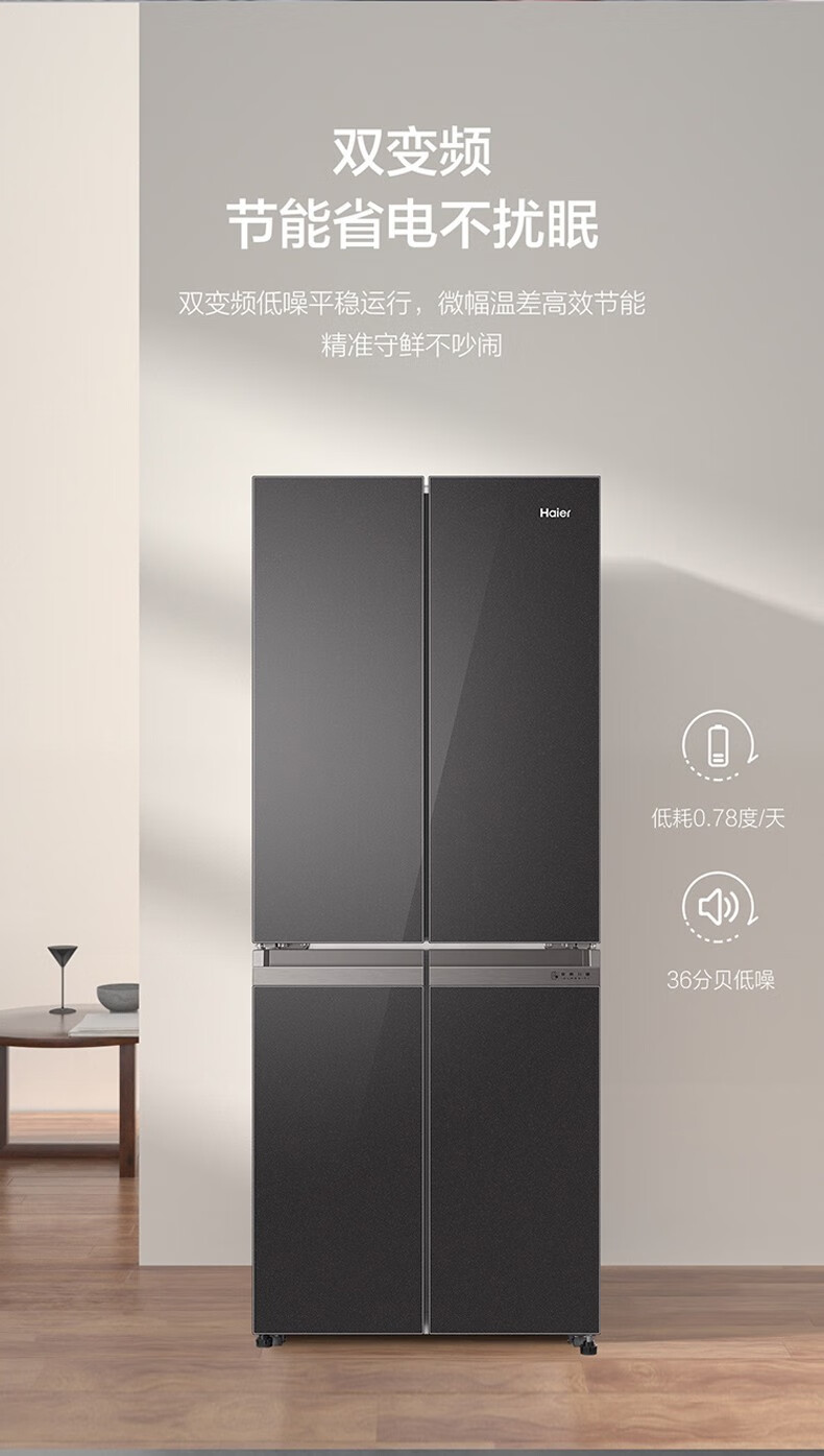 海尔(Haier)406升十字对开门大容量家用冰箱 一级能效双变频风冷无霜三档变温 DEO净味 406升智联WIFI玻璃面板玉墨银