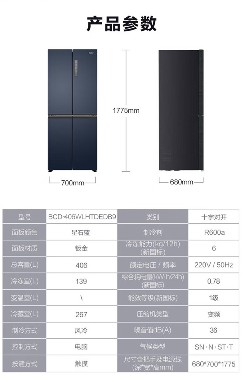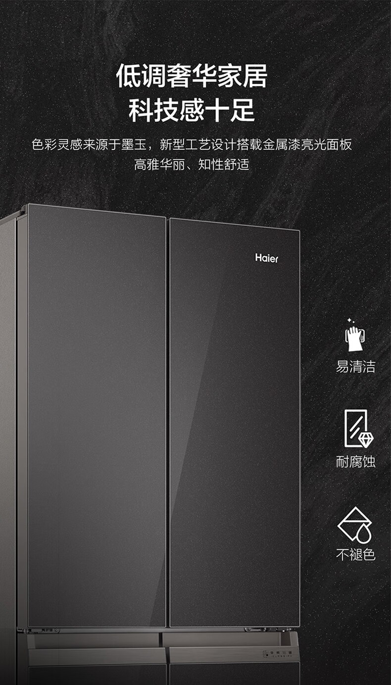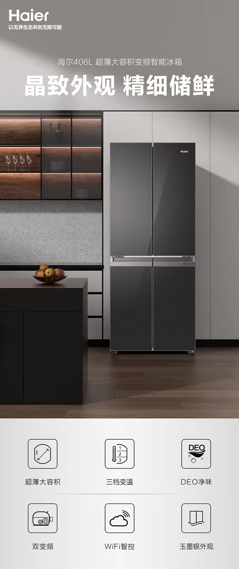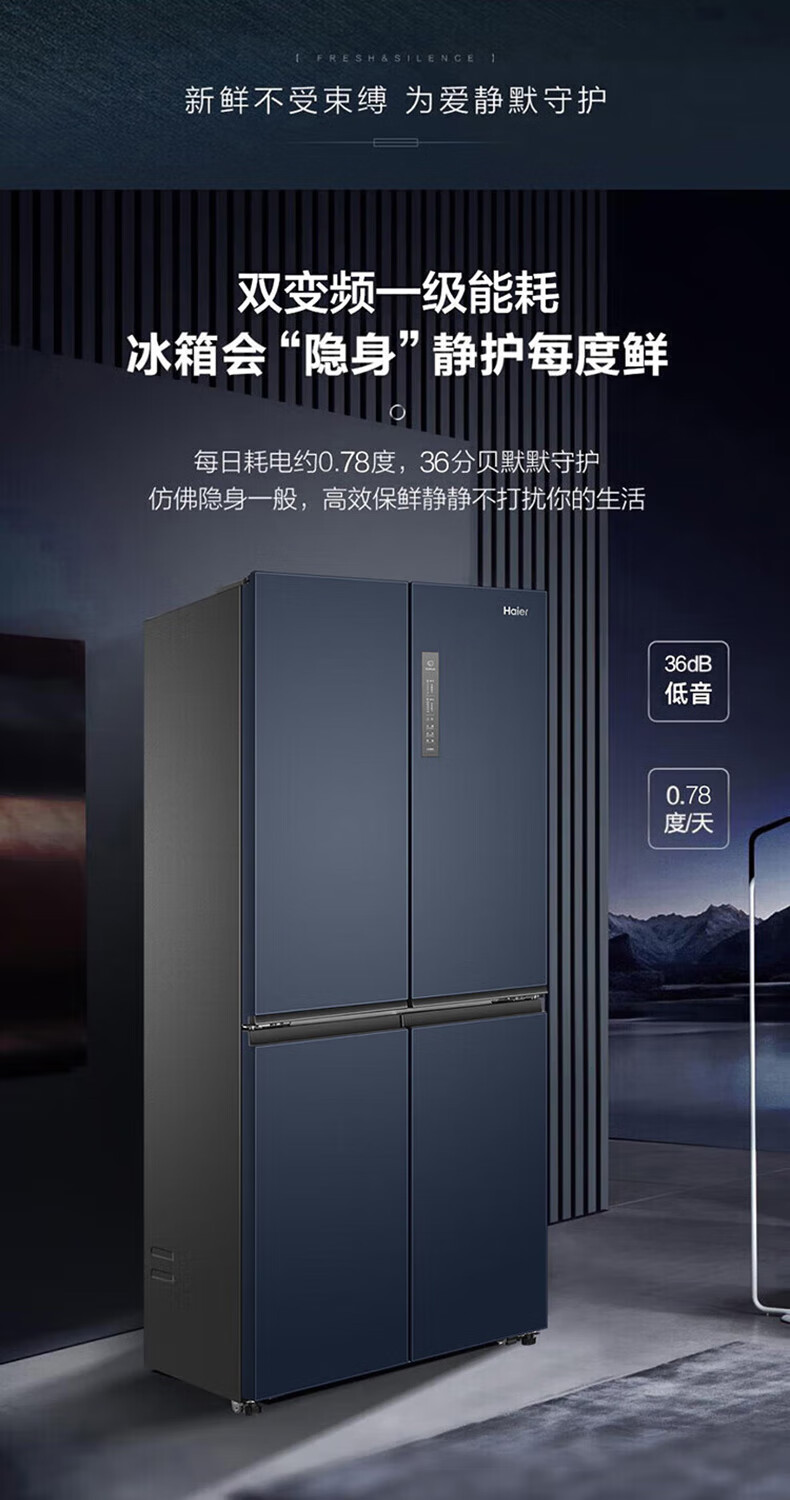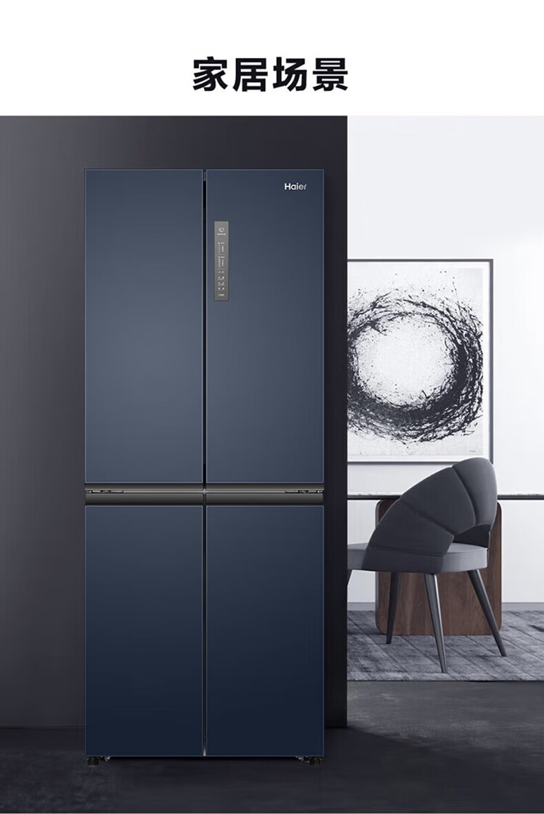 海尔(Haier)406升十字对开门大容量家用冰箱 一级能效双变频风冷无霜三档变温 DEO净味 406升智联WIFI玻璃面板玉墨银
