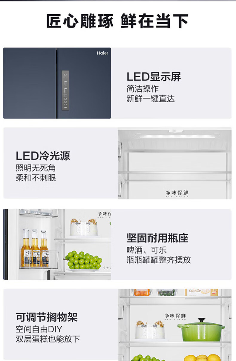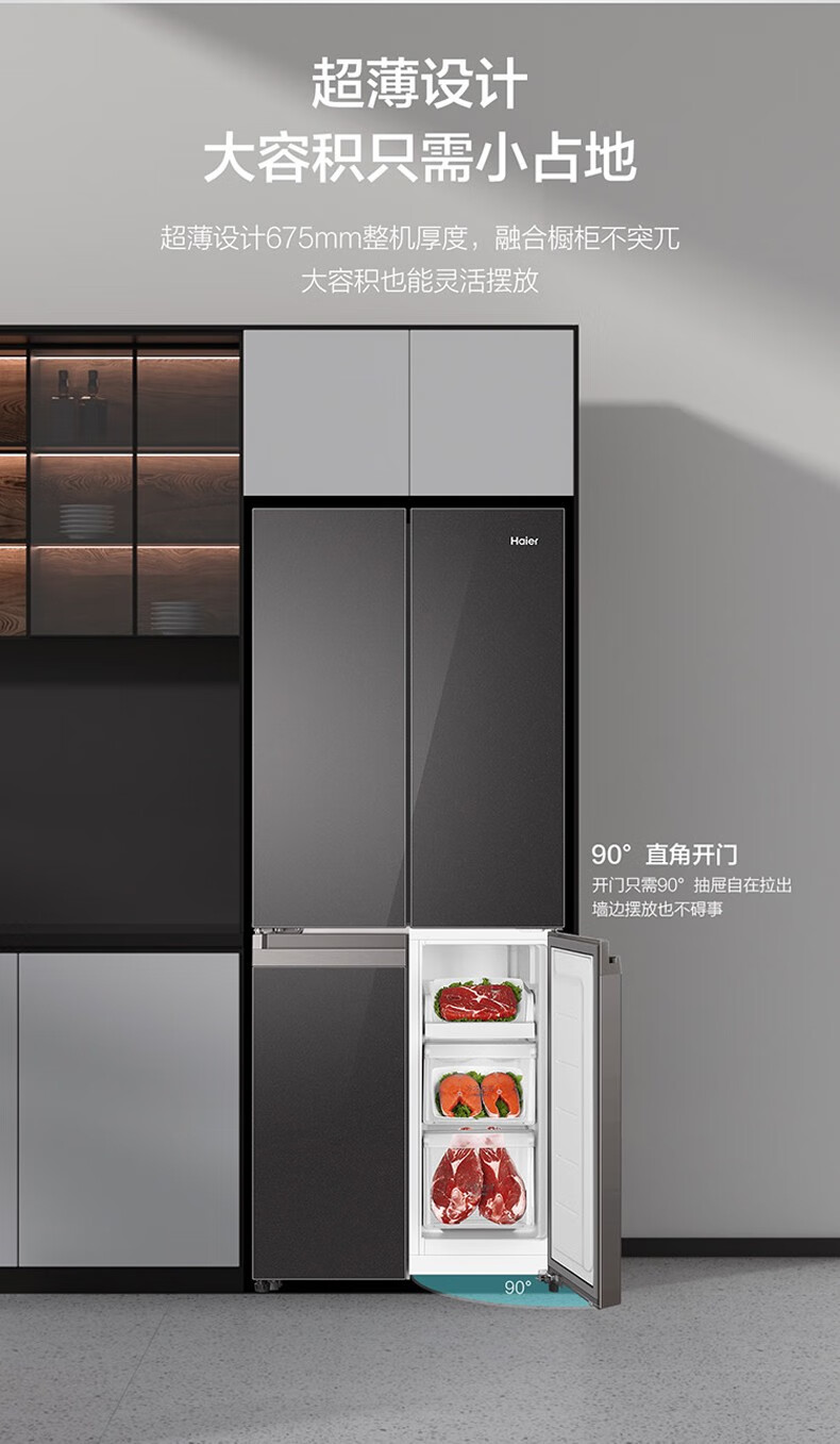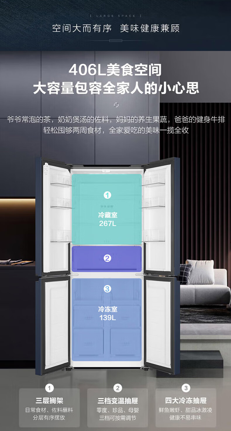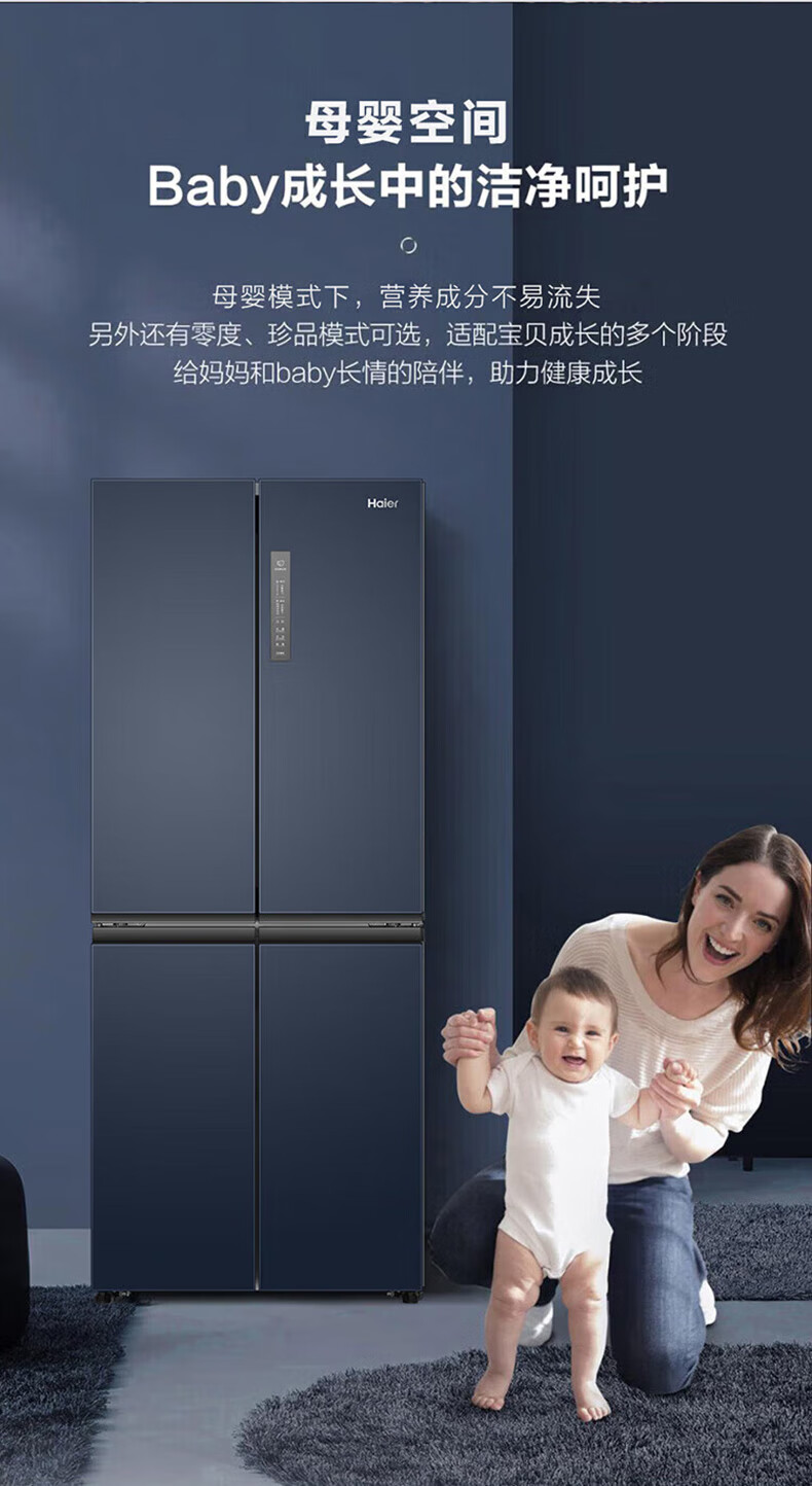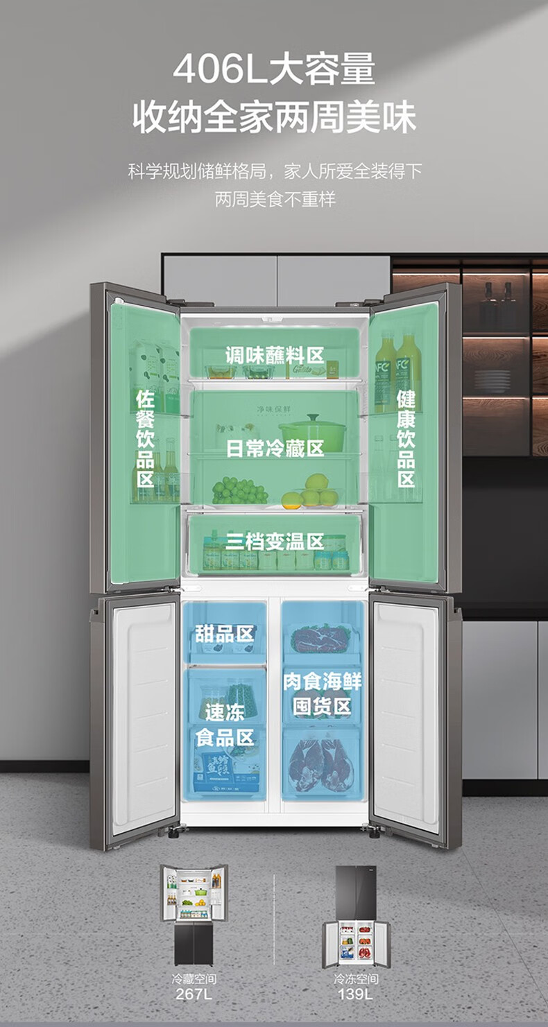 海尔(Haier)406升十字对开门大容量家用冰箱 一级能效双变频风冷无霜三档变温 DEO净味 406升智联WIFI玻璃面板玉墨银