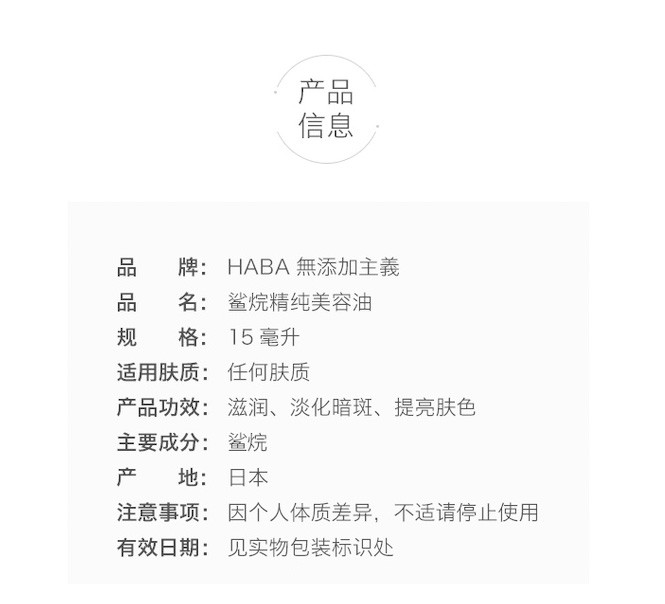 HABA 鲨烷精纯护肤美容养肤面部精油15ml第一代 【售价】:¥54 下单链接: